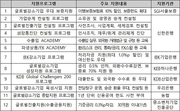 세부내용으로 중기부는 해외마케팅 지원 및 기술개발사업 우대 선정을 통해 해외진출과 신제품 개발을 촉진하고, 지자체는 지역별 글로벌 강소기업 전용 프로그램을 마련해 사업화를 지원하며, 민간 금융기관은 융자 및 보증을 지원한다.