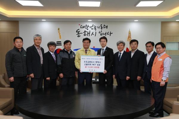 과천시는 22일 강원도 산불로 피해를 입은 우호교류도시인 동해시를 방문해 심규언 동해시장에게 빠른 피해복구를 기원하며, 수해복구 성금으로 총 1,288만원과 관내 기업, 단체, 개인 봉사자들에게 기부받은 밥솥과 이불, 생활필수품 등 총 650만원 상당의 구호물품을 함께 전달했다.