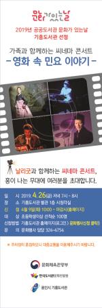 용인시 기흥도서관이 오는 26일 별관1층 시청각실에서 영화 속 민요이야기를 주제로 ‘가족 씨네마 콘서트’ 무료 공연을 한다고 밝혔다.