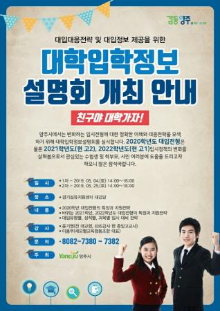 양주시는 변화하는 대학입시전형에 대한 정확한 이해와 대응전략을 모색하고자 오는 5월 4일과 25일, 경기섬유지원센터 대강당에서 대학입학 정보설명회 ‘친구야 대학가자’를 개최한다.