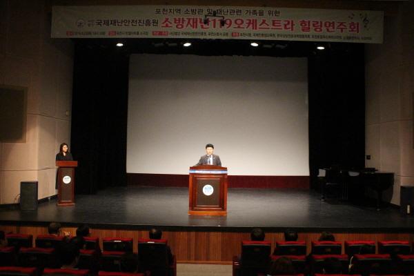 국제재난안전진흥원이 주최하고 포천소방서와 공동 주관한 이번 연주회는 박윤국 포천시장, 박용호 포천소방서장, 포천지역 소방관 및 재난관련 가족 등 250여 명이 참여하였으며, 소방재난 119오케스트라와 국립창극단의 연주를 통해 소방공무원 및 소방가족분들의 지친 심신을 치유할 수 있는 자리가 됐다..