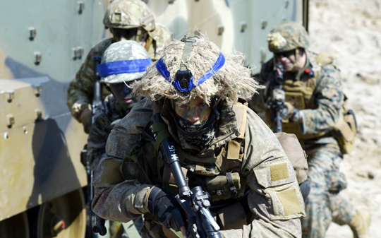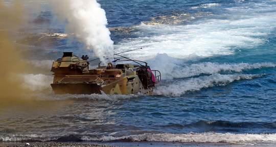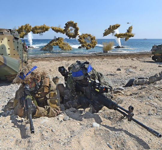 | 12일 경북 포항시 독석리 일대에서 열린 한미 연합상륙훈련 ‘결정적 행동’에서 상륙돌격장갑차를 이용, 해안으로 침투한 연합군이 전방을 경계하고 있다. (사진=국방일보) |