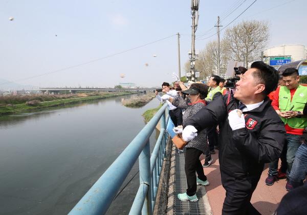 참석자들은 하천바닥에 퇴적된 오염물질 분해를 위해 유용미생물 발효액으로 만든 EM흙공 1천개를 굴포천에 투입하고 주변 쓰레기를 수거했다.
