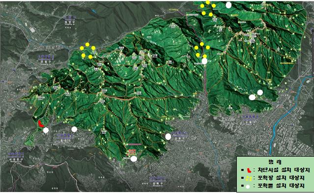 | 포획틀, 포획장 및 도심 진입 차단시설 설치 대상지 |