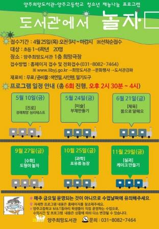양주희망도서관은 양주고등학교 동아리 M&T와 함께 오는 5월 10일부터 11월 29일까지 총 6회에 걸쳐 지역연계 프로그램 ‘도서관에서 놀자’를 운영한다.