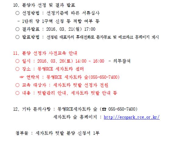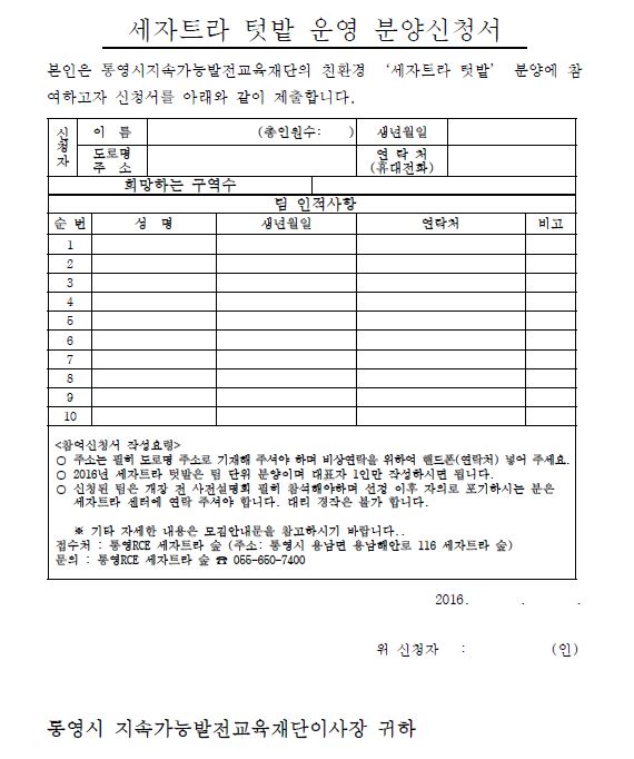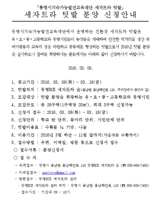 각 구역 당 20㎡, 총 26구역으로 이루어진 “세자트라 텃밭”은 각 팀당 최대 3구역까지 신청이 가능하다. 분양기간은 3월부터 11월까지이며, 연간 사용료 대신 수확물 1/3을 지역사회에 나누는 조건이다. 신청은 ‘통영RCE 세자트라숲’ 홈페이지(http://ecopark.rce.or.kr)에서 신청서를 다운로드하여 작성 후, 우편이나 이메일(applyrce@gmail.com)로 보내거나 직접 방문하여 하면 된다.