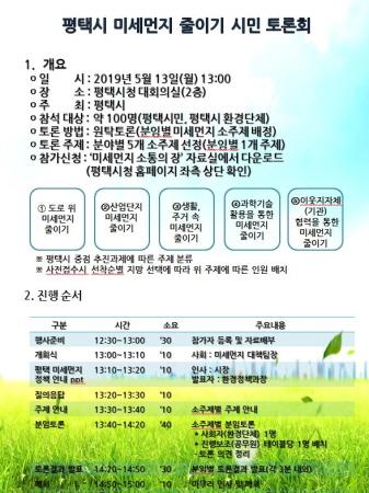 평택시에 주소를 둔 시민이거나 관내 직장 및 학교에 소속된 사람 중, 평택시 미세먼지 정책에 관심이 있는 시민이면 누구나 신청 가능하며 토론회 신청을 원할 경우 다음달 7일까지 평택시청 홈페이지에서 양식을 다운받아 메일 또는 팩스로 신청하면 된다.