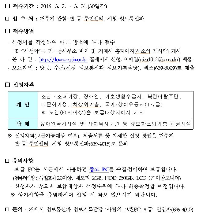 경상남도와 거제시에서는 공공기관에서 교체되어지는 중고PC를 수집 후 정비하여 PC 구입이 어려운 이웃에게 무상으로 보급하는 “사랑의 그린PC 보급” 사업을 추진하고 있습니다. 사랑의 그린PC가 필요하신 분들께서는 아래 사항을 참고하여 신청하여 주시기 바랍니다.