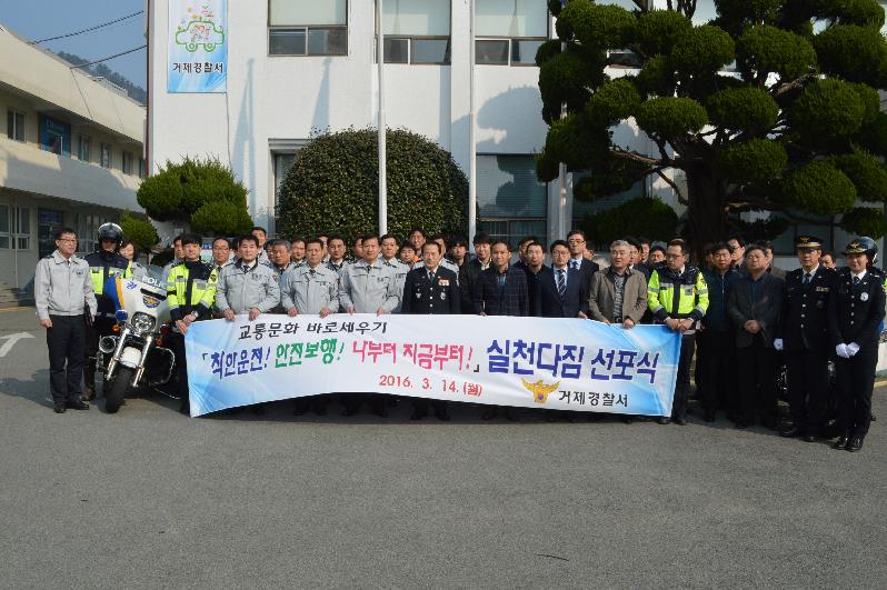 거제경찰서(서장 김영일)는 지난 14일 09:00경 교통사고 없는 안전한 거제를 구현하기 위해 거제경찰서 전 직원이 교통법질서준수 적극 실천을 다짐하는 「교통문화 바로세우기, 착한운전 안전보행 나부터 지금부터!」실천다짐 선포식을 가졌다.