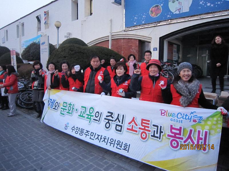 행사에 참여한 수양동 주민자치위원장(신기민)은 “세계 조선경기 불황으로 거제조선소가 어렵지만, 함께 어려운 시기를 이겨나갈 수 있도록 지역주민들도 할 수 있는 많은 노력을 하겠다.”고 말했다.