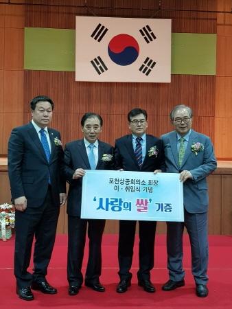 포천상공회의소는 지난 24일 포천종합체육관에서 회장 이·취임식을 개최하며, 화환 대신 받은 포천 쌀 10kg 164포과 20kg 60포를 어려운 이웃에게 사용해 달라며 포천시에 전달했다.