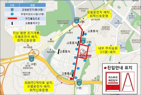 모범운전자 등 총 41명의 인원을 코스트코 주변에 배치해 진출입 차량을 유도하고 예솔유치원, 아이데코 등 인접 건축물의 교통영향이 없도록 통제한다.