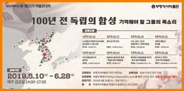 부평역사박물관은 ‘3.1운동 및 임시정부 100주년’을 기념해 제23기 박물관대학 수강생을 모집한다. 이번 박물관대학은 ‘100년 전 독립의 함성, 기억해야 할 그들의 목소리’라는 주제로 오는 5월 10일부터 8주간 매주 금요일 오후 2시부터 5시까지 진행된다.