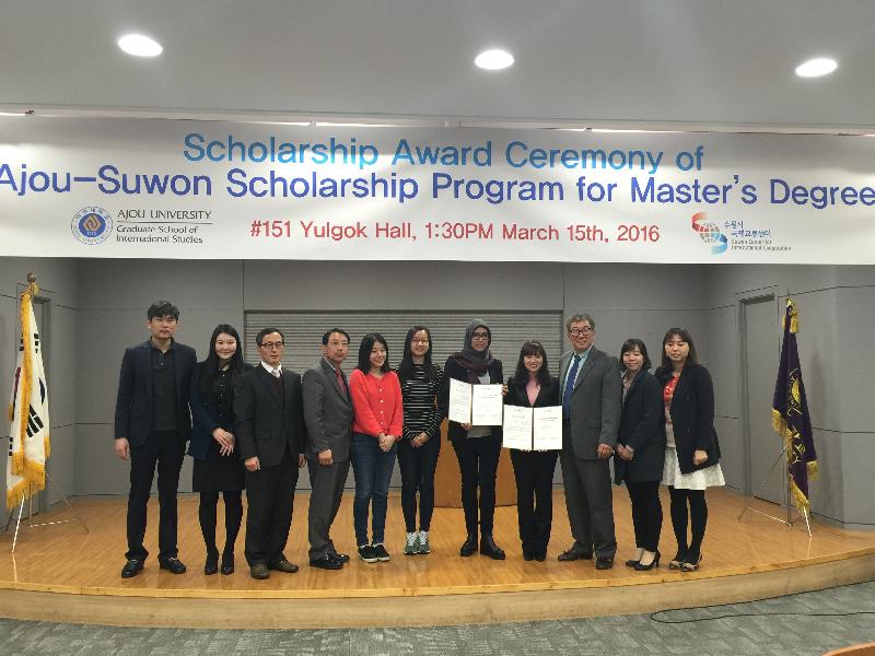 (재)수원시국제교류센터는 15일 아주대학교 율곡관 영상회의실에서‘2016 아주-수원 석사과정장학지원 프로그램’의 장학금 수여식을 개최했다.