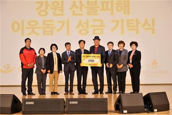 지난 24일 오후 3시 철원군 ㈜그래미에서 개최한 ‘2019년 강원여성 지도자 역량강화 워크숍’개회식에서 ㈜그래미 남종현 회장이 산불피해로 고통받고 있는 5개 시군에 2억원의 성금을 사회복지공동모금회를 통해 전달했다.