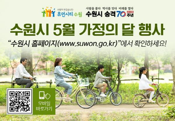수원시 홈페이지에 접속해 왼쪽 위의 배너를 클릭하면 웹페이지로 연결된다. 웹페이지에는 가정의 달 행사안내를 어린이, 청소년, 가족, 전시·공연·스포츠 등 4개 분야로 분류해 놓았다.
