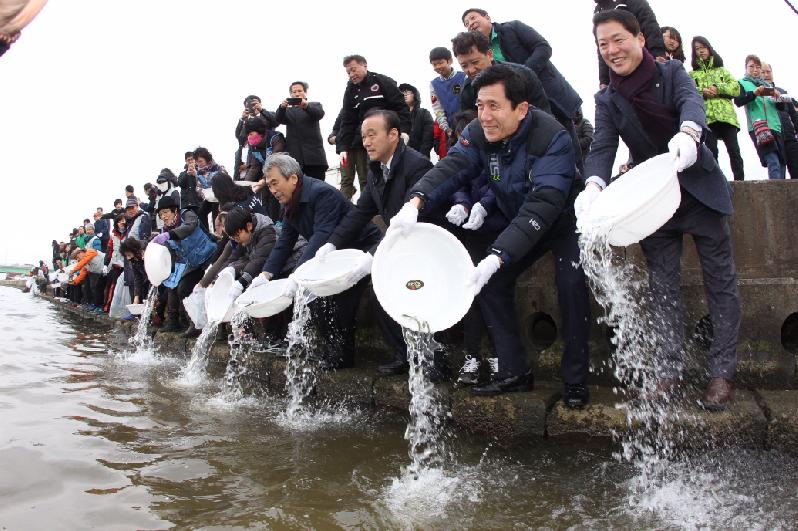 ‘제7회 형산강 어린연어 방류행사’가 14일 연일대교 옆 형산강둔치에서 열렸다. 지난해에 이어 올해도 포항시와 경주시가 형산강프로젝트의 환경생태벨트 일환으로 두 도시를 가로지르는 친수공간에서 합동 방류행사를 가졌다. 이날 행사에는 이강덕 포항시장과 최양식 경주시장을 비롯해 권영길 경주시의회 의장 등 양도시 기관·단체장, 학생 등 200여명이 참석해 양도시간 상호우의를 다졌으며, 형산강에 대한 관심과 수질환경보전에 대한 의식을 제고하는 등 앞으로도 지속적으로 관심을 갖고 보존, 개발하기로 했다. 이날 행사는 경북 민물고기연구센터에서 부화된 어린연어 50여만마리를 지원받아 진행됐으며, 참가자들은 방류 전 수질환경 개선과 어린고기들이 잘 적응 할 수 있는 환경을 조성하기 위해 미생물발효(EM) 제품인 EM 흙공을 일제히 강변에 투척한 후 어린연어 방류를 했다. 포항시는 지난 2010년부터 시민들과 함께 어린연어 165여만마리를 형산강 일원에 방류한 바 있으며, 이번에 방류한 어린연어는 형산강에서 잠시 머물다 5∼6월중 동해를 거쳐 북해도, 베링해, 북태평양까지 18,000km정도의 긴 여정을 마친 뒤 3∼5년 후 모천인 형산강으로 40∼85cm의 성어가 되어 돌아오게 된다. 이강덕 포항시장은 “경주와 포항은 연어가 돌아올 고향으로, 양도시가 힘을 합쳐 형산강 프로젝트를 실현함으로써 두 도시의 미래창조에 기여하고 큰 성어가 되어 회귀하는 연어처럼 수질환경 개선과 보존에 앞장서 나갈 것”이라며 “뜨거운 관심을 가져준 양도시민들에게 감사하다”고 말했다. 한편, ‘형산강 프로젝트’는 역사·문화·경제 공동체로서 상생발전을 위해 양도시가 2015년 2월 12일 상호 MOU를 체결한 후 야심차게 기획·추진되고 있는 대규모 프로젝트사업이다. 시는 형산강의 발원지를 거슬러 올라가면서 강변을 정비하고 생태환경을 조성하고자 올해부터 형산강 레저타운 조성(90억), 형산강 에코생태탐방로(35억원), 형산강 상생로드(20억원) 등 145억원을 투입해 수변지역을 개발 중에 있으며, 바다의 수산자원조성을 위해 바다숲조성(4억), 연안바다목장(10억), 전복, 해삼 등 종묘방류(12억) 등 21억원을 투입해 연안 생태계 복원에도 힘쓰고 있다.