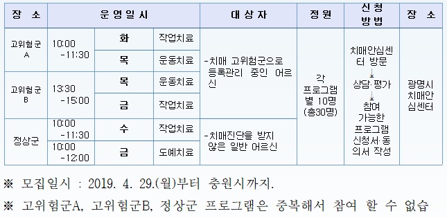 치매 고위험 군으로 등록관리 중인 대상자 및 일반 대상자로 나누어 3개 프로그램을 운영할 예정이며 모집인원은 프로그램별로 10명씩, 모집기간은 4월 29일부터 충원 시까지이다.
