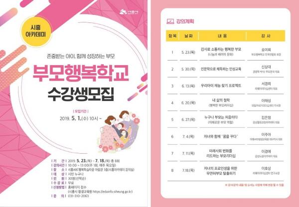 시흥시는 오는 5월 23일부터 7월 18일까지 총 8회에 걸쳐 부모행복학교를 운영한다.