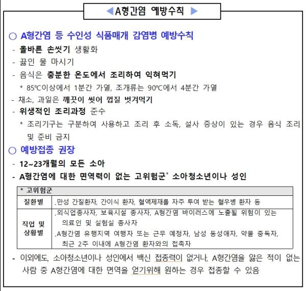 따라서, A형간염에 대한 면역력이 없는 30~40대는 예방을 위해 A형간염 접종 뿐 만 아니라 끓인 물 마시기, 음식 익혀먹기, 위생적인 조리과정 준수, 올바른 손씻기 등 수인성 식품매개 감염병 예방수칙을 준수해야 한다.