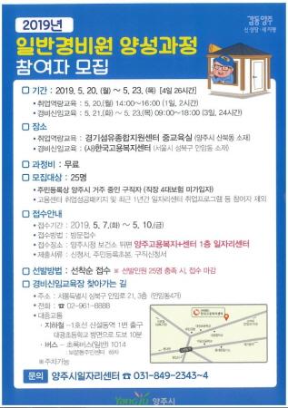 양주시일자리센터는 오는 5월 7일부터 10일까지 2019년 취업지원프로그램, ‘일반경비원 양성과정’의 참여자를 모집한다.