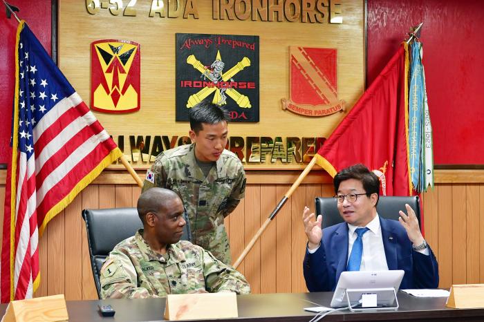염태영 시장은 방공포대대 부대장 매튜 A. 워커 중령을 만나 환담하고, 부대를 시찰했다.