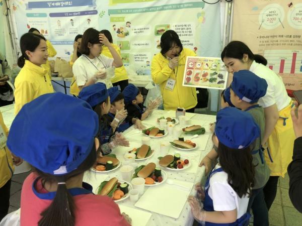 어린이와 함께하는 ‘꽃게 샌드위치 만들기’ 활동을 통해 요리재료인 채소와 과일을 직접 만져보고 각 재료별 효능을 알아보는 시간을 가졌으며, 재미있는 룰렛·다트게임을 통해 5가지 식품군과 음식을 골고루 먹어야 하는 중요성에 대해 홍보했다.