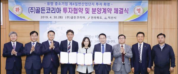 이날 협약에 따라 ㈜골든코리아는 익산 제4일반산업단지 13,223㎡ 부지에 90여억 원을 투자하고 30여명의 근로자를 고용할 계획으로 투자가 성공적으로 마무리되면 산단 활성화 및 일자리 창출에 기여할 것으로 기대된다.