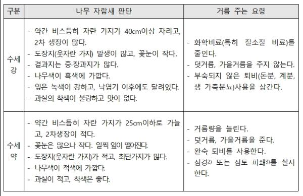 단, 표준 거름량을 참고하되 토양 상태와 나무 자람새를 종합적으로 관찰해 실제 거름량을 결정하고 거름 주는 방법도 판단해야 한다.