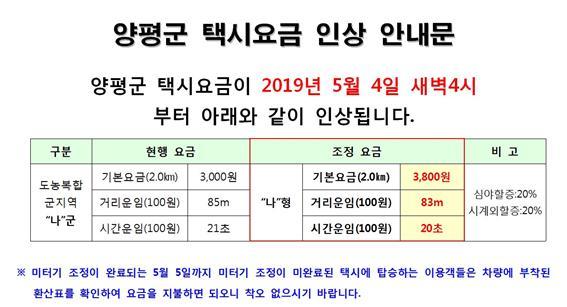 양평군은 5월 5일 종합운동장 주차장을 확보해 관내 택시 208대에 대해 검정기관을 통해 신속히 미터기 수리검정을 마칠 계획으로 택시요금조정 시행에 따른 주민 불편을 최소화하는 등 5월 한달간 주민 택시요금 인상 홍보를 지속적으로 실시 할 계획임을 밝혔다.