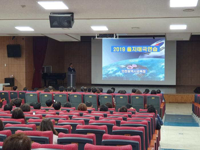 인천광역시교육청(교육감 도성훈)은 1일 정보지원센터 대회의실에서 진행된 행복소통만남회의 시간에 2019년도 을지태극연습 준비보고 및 직원교육을 실시했다.