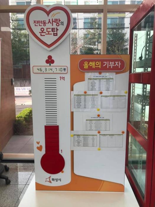 화성시 진안동은 주민센터 로비에 설치된 사랑의 온도탑에 후원자를 수시로 기재해 후원에 대한 감사함과 이웃사랑 실천의 나눔문화를 확산시키고 있다.