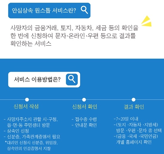 ‘안심상속 원스톱 서비스’는 사망자의 금융거래, 토지, 자동차, 세금 등의 확인을 한 번에 신청하여 문자·온라인·우편 등으로 결과를 확인하는 서비스다.