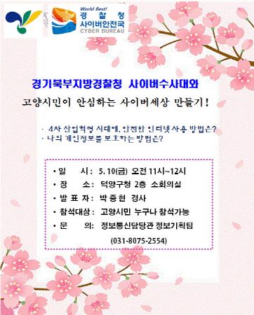 고양시는 오는 10일, 경기북부지방경찰청 사이버수사대 박중현 경사를 초빙해 덕양구청 2층 소회의실에서 ‘고양시민이 안심하는 사이버세상 만들기’ 행사를 11시부터 12시, 한 시간 동안 진행할 예정이다.