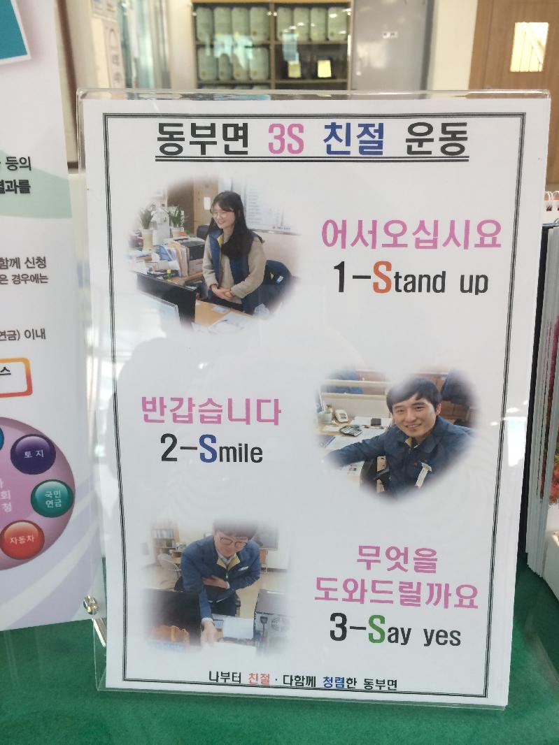 이날 친절 3-S 교육은 일어서서 민원을 맞이하고(Stand-up), 상냥하고 밝은 미소로 응대하며(Smile), 긍정적인 마인드로 민원을 처리(Say-yes)하자는 컨셉으로 진행되었으며 밝은 목소리와 미소로 민원인들 맞이하는 3단계 인사 연습(어서 오십시오- 반갑습니다 - 무엇을 도와 드릴까요?)도 병행했다.