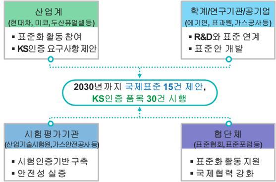 앞으로 표준화 로드맵에 반영된 9개 과제를 효과적으로 추진하기 위한 각 기관별 역할 분담 방안으로는 미코, 가온셀, 에스퓨얼셀 등 연료전지 업계는 안전한 제품 보급을 위한 KS인증 요구사항을 제안하고, 현대자동차, 두산퓨얼셀 등 대기업은 수소상용차, 발전용 연료전지 등의 글로벌 시장 확대를 위한 국제표준화 활동에 적극 협력하기로 했다.