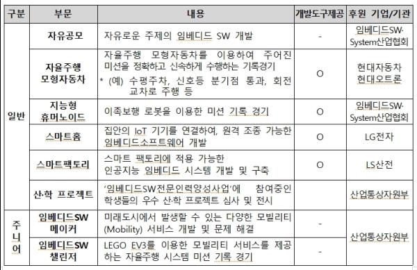 가정의 모든 기기를 인터넷을 통해 연결, 원격으로 조종할 수 있게 해주는 ‘스마트홈’ 관련 임베디드소프트웨어 개발을 LG전자 후원으로 진행할 예정이며, LS산전 후원으로 ‘스마트팩토리’와 관련된 인공지능 임베디드시스템 개발도 진행해, 참가자들이 생산성, 품질, 고객만족도를 향상시키는 지능형 생산공장을 자유롭게 구현해 볼 수 있도록 할 예정이다.