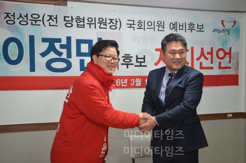 | 17일 정성운 예비후보가 기자회견 후 이정만 예비후보와 기념사진을 찍고 있다. |