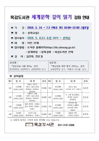 시흥시 목감도서관은 오는 14일부터 7월 2일까지 총 8회에 걸쳐 ‘세계문학 깊이 읽기’ 문학 강좌를 운영한다.