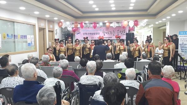 단원구여성합창단은 지난 3월에 서안산노인전문병원과 안산효요양병원의 어르신들을 찾아 합창과 하모니카, 색소폰 연주 등을 통해 무료한 일상을 보내던 어르신들의 어깨를 들썩이게 했다.