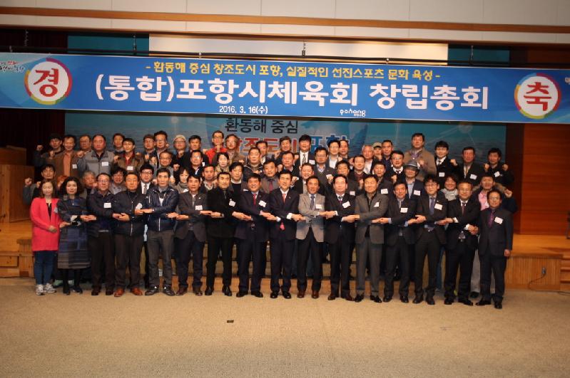 포항시는 16일 시청 대회의실에서 양 체육단체 대의원 75명이 참석한 가운데 통합 포항시체육회(Pohang Sports Council-PHSC)를 출범하는 창립총회를 개최했다. 이날 총회에서는 지난 2월 29일 통합추진위원회에서 제정‧심의 의결한 포항시체육회 규약을 심의하는 한편 이강덕 포항시장을 만장일치로 초대회장에 추대하고, 임원 공백의 최소화로 통합체육회의 원활한 운영을 위해 부회장 및 이사 등 임원 선임 권한을 회장에게 위임하도록 하는 심의안건을 의결했다. 이번 엘리트체육과 생활체육을 통합하는 창립총회는 선진국형 체육시스템 확립을 위한 정부의 대한체육회와 국민생활체육회를 통합하는 「국민체육진흥법」이 지난해 3월 개정됨에 따라 통합추진 가이드라인을 준용해 포항시와 양 체육단체가 추천한 10명의 위원으로 포항시 체육단체 통합추진위원회를 구성하고, 두 차례에 걸쳐 위원회를 개최해 통합 포항시체육회 규약을 비롯한 제 규정과 종목별 단체 통합일정 등을 심의‧의결함에 따라 개최하게 됐다.
