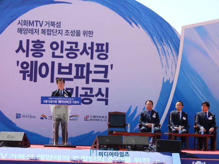 2일 도에 따르면 이날 오후 2시 시흥 시화 멀티테크노밸리(시화 MTV)에 위치한 거북섬에서 시흥 인공서핑 웨이브파크 기공식이 열렸다. 이날 기공식에는 이재명 경기도지사와 임병택 시흥시장, 이학수 한국수자원공사 사장, 최삼섭 대원플러스그룹 회장, 문성혁 해양수산부장관, 조정식‧함진규 국회의원 등 500여명이 함께 공사 시작을 축하했다.