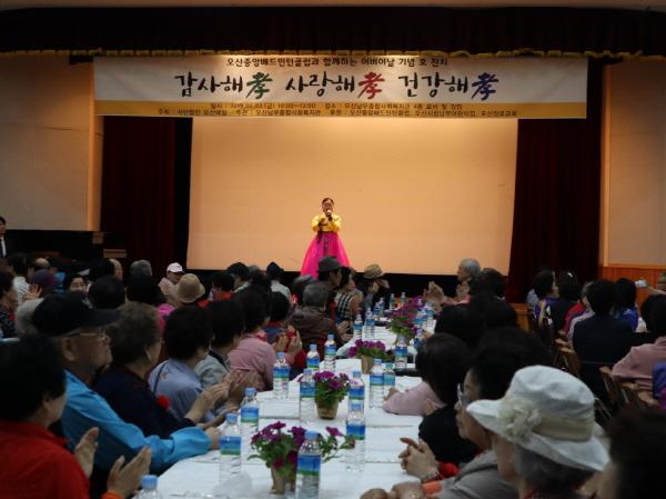 행사는 오산시립남부어린이집 원아들의 앙증맞은 율동을 시작으로 하늘소리 예술단 · 한마음밴드의 흥겨운 공연과 카네이션 달아드리기 등 다양한 이벤트가 진행되었으며, 오산중앙배드민턴클럽 · 신장동 경로효친회 · 봉사하는 주부회 등 다양한 단체가 참여해 정성스러운 식사를 준비해 어르신들에게 제공해드렸다.