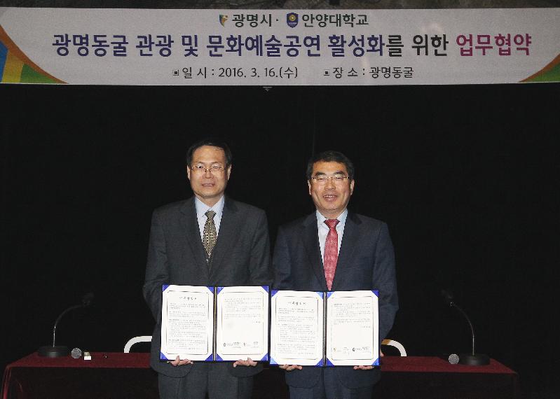 양기대 광명시장은 지난 16일 광명동굴에서 안양대학교 정창덕 총장과 업무협약을 맺고, 광명동굴을 이용한 문화·예술·공연 프로그램 상호 공유 및 교류에 적극 협력하기로 했다.