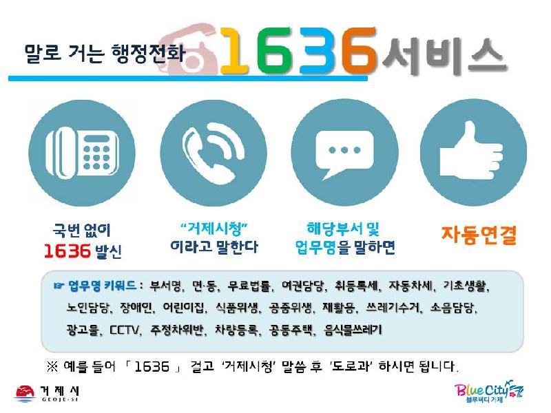 국번 없이 1636 발신 후 ‘거제시청’이라 말한 후 부서명이나 면·동, 업무명을 말하면 바로 연결이 된다. 예를 들어 여권업무를 보고 싶으면 ‘1636’ 발신 후 → ‘거제시청’→ ‘여권’이라 말하면 바로 연결된다.