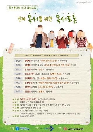 관내 활동 중인 독서동아리회원 또는 독서동아리 구성계획이 있거나 독서모임에 관심있는 고양시민은 누구나 참여 가능하며, 오는 5월 13일 오전 10시부터 고양시도서관센터 홈페이지를 통해 선착순 30명을 모집한다.