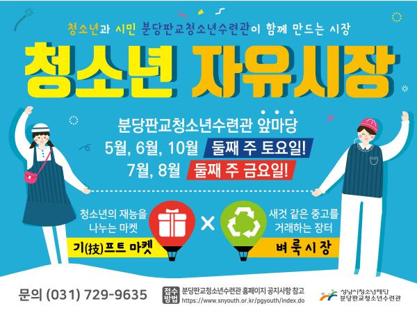 성남시청소년재단 분당판교청소년수련관은 오는 11일 오후 1시부터 분당판교청소년수련관 앞마당에서 2019년 청소년 자유시장을 개최한다.