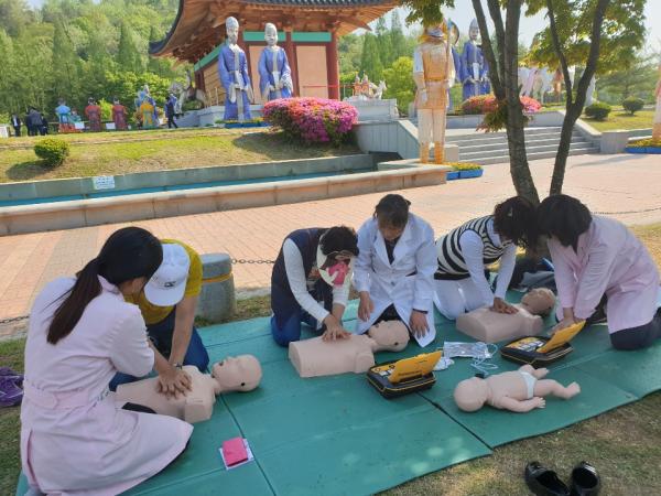이날 의료지원반은 행사장을 찾는 남녀노소를 대상으로 심정지 환자 발생 시 뇌손상을 막을 수 있는 골든타임 4분의 중요성과 전조증상, 심폐소생술 응급처치사례, 자동심장충격기 사용법 등 마네킹을 이용한 심폐소생술 체험을 진행했다.