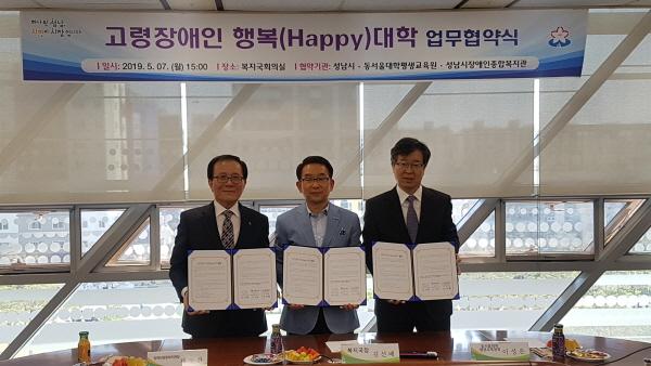 성남시와 동서울대학교, 성남시장애인종합복지관은 지난 7일 오후 3시 시청 5층 복지국 회의실에서 ‘고령 장애인 평생교육 지원에 관한 업무 협약’을 했다.