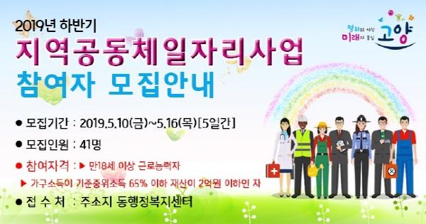 고양시가 저소득 취약계층에게 일자리를 제공해 생활안정 지원 및 지역 유휴자원 활용을 통한 공동체 활성화를 위해 시행하는 ‘2019 하반기 지역공동체 일자리사업’ 참여자 41명을 모집한다.